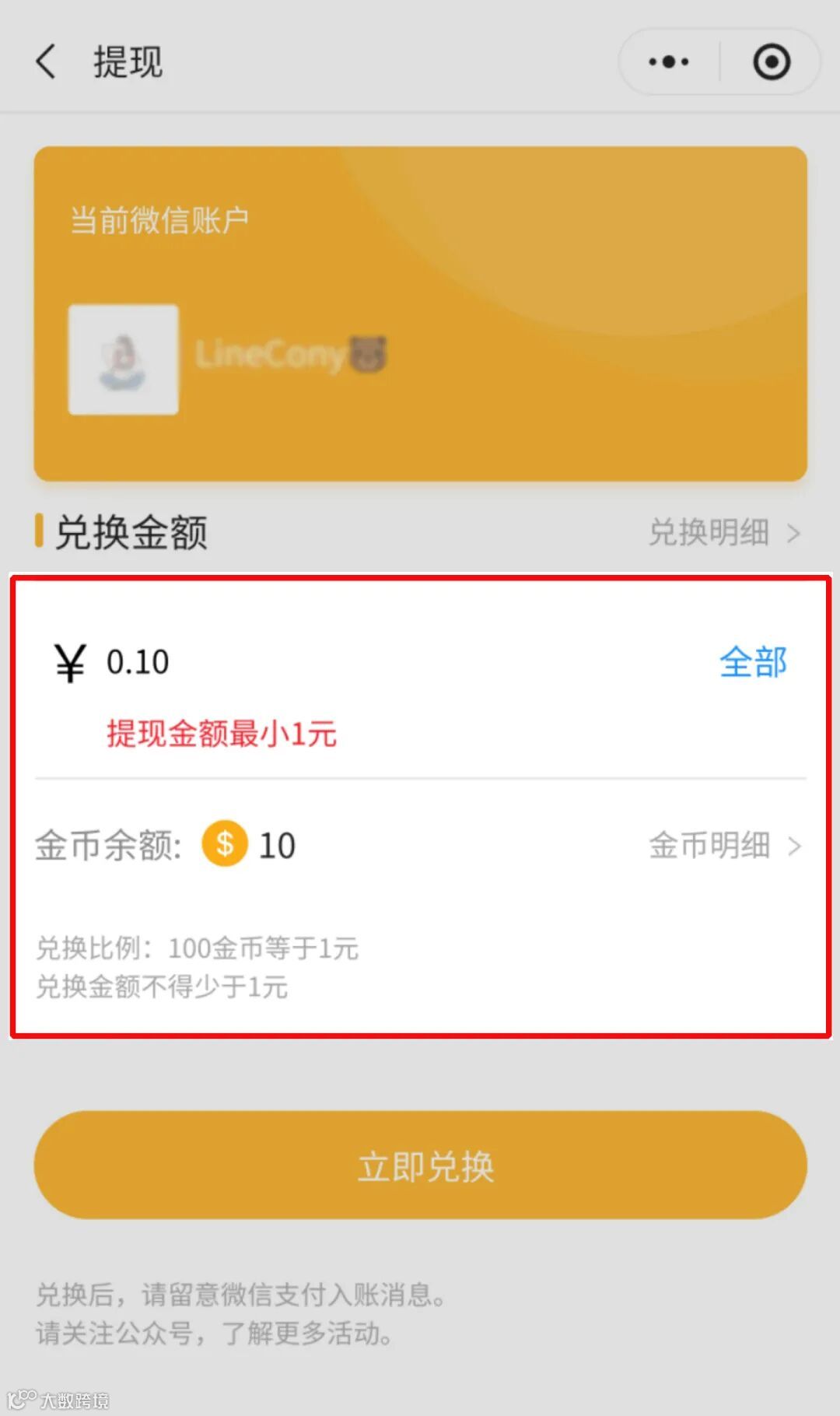 金币可随时兑换(钱包升级,满1元即可提现)