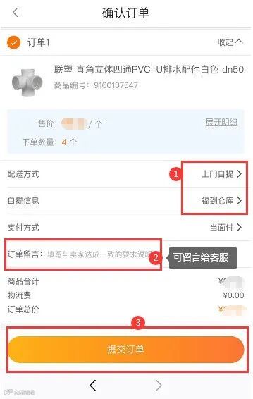 1. 配送方式选择上门自提;2. 进入自提信息填写页面完善内容;3. 添加留言;4. 提交订单。