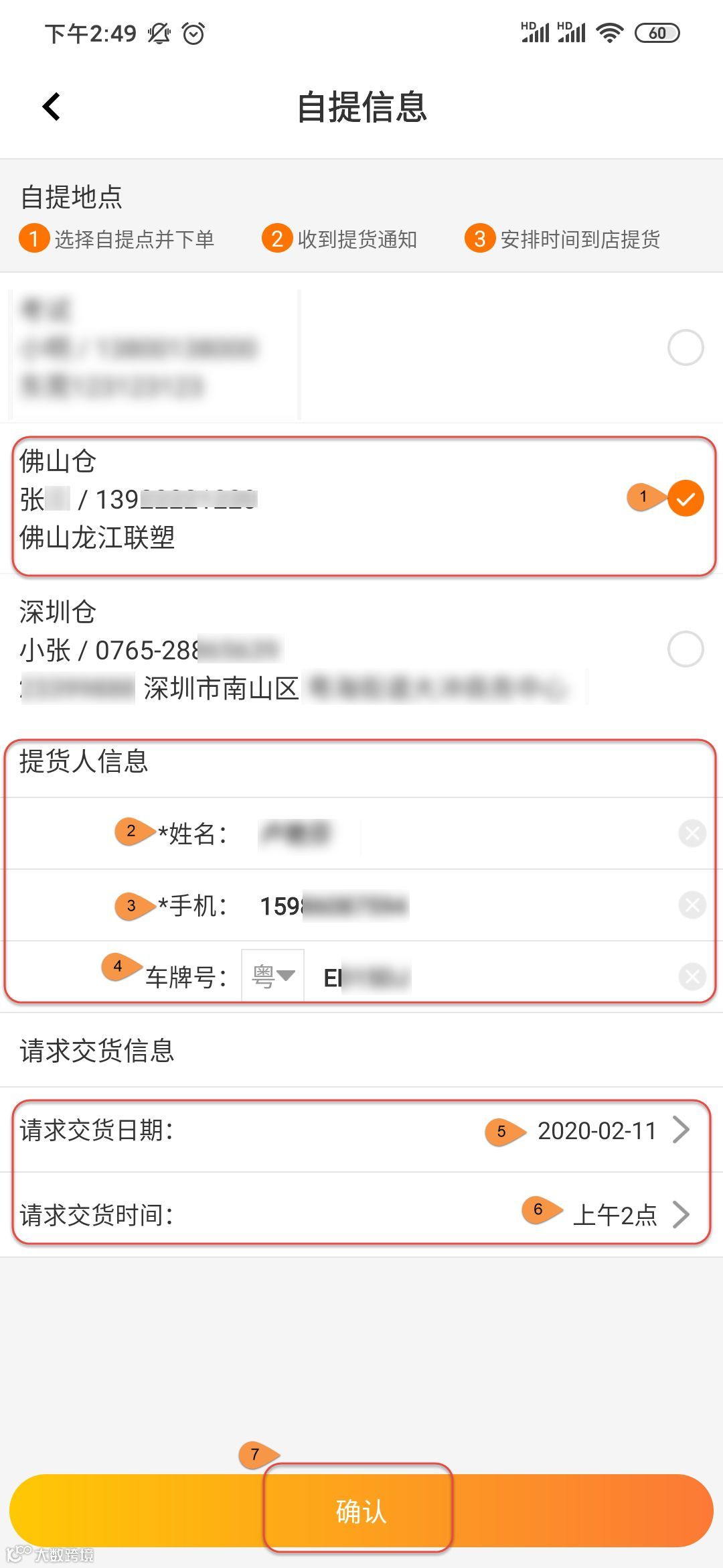 1. 选择提货地点;2. 完善提货人信息:姓名/联系手机/车牌号(如有);3. 填写请求交货信息(如有):请求交货日期/时间。