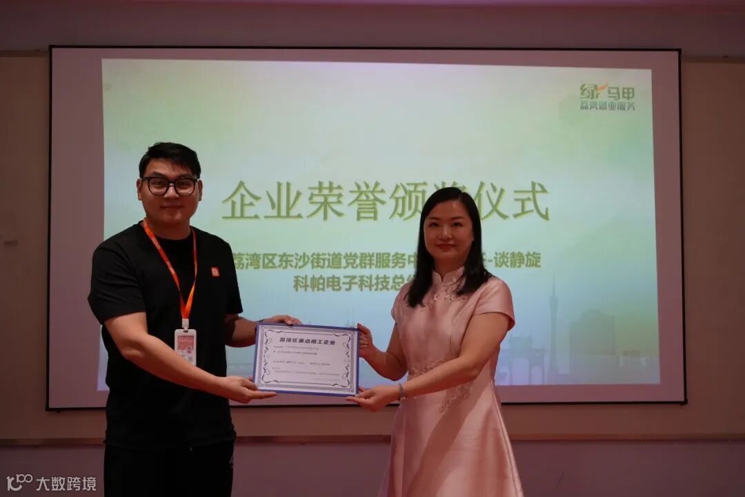 就业品牌活动于9月19日下午顺利举行,荔湾区东沙街道党群服务中心副主任谈静旋授予科帕电子“荔湾区重点用工企业”荣誉证书,科帕电子总经理吕琪先生出席了颁奖仪式。