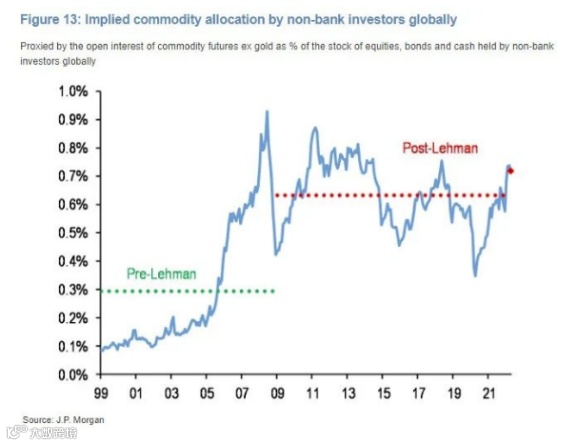虽然目前投资者对大宗商品的配置高于历史平均水平,但并没有过多的超配。他们说,这意味着大宗商品的配置占比仍有上行空间。