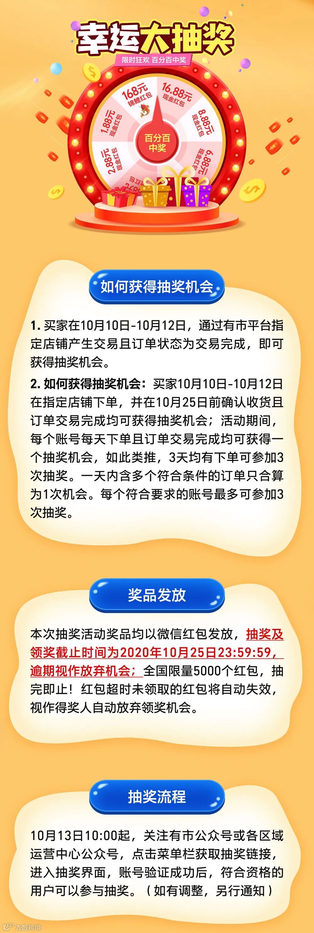 导读:有市三周年活动嗨翻天满额送、抽大奖周年庆钜惠福利重磅来袭!01活动一:抽168元锦鲤红包! 02活动二:你买