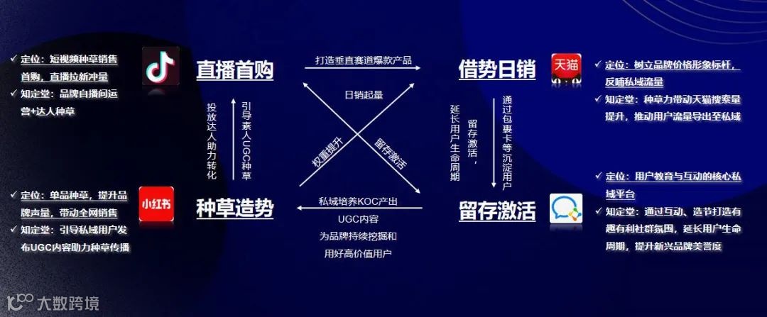 在抖音进行直播首购,小红书进行种草造势,天猫进行借势营销,私域企微进行留存激活。同时,将私域和公域打通进行用户共享,各公域平台导流至私域进行精准化运营,通过一定周期的挖掘培养,将不同特性的用户反哺至各个平台。