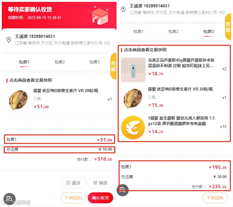 混合商品订单分单发货后,手机端各个包裹显示此包裹的商品总价(各个包裹的运费统一显示总运费)