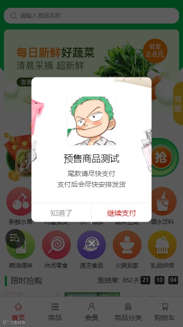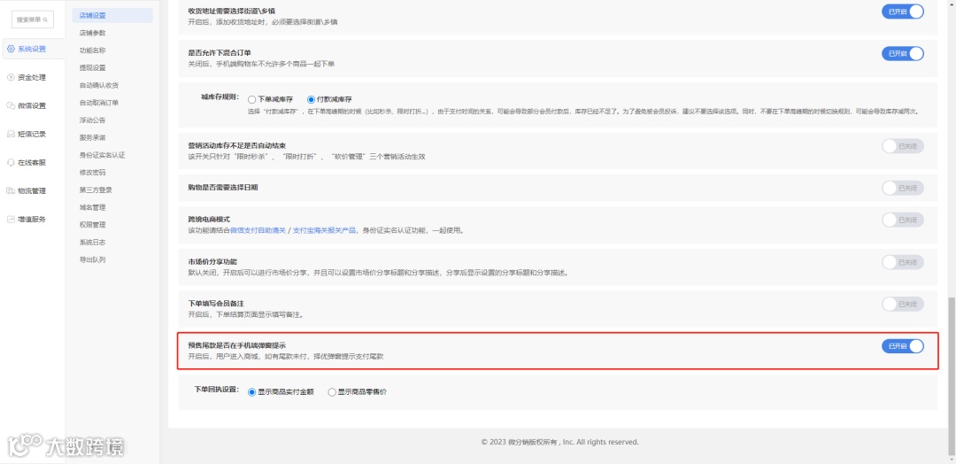 店铺设置-购物设置-开启预售尾款弹窗提示后,进入商城首页后会有弹窗提醒。如若与商城待支付订单弹窗提醒同时开始时,只会弹预售尾款订单弹窗,没有预售尾款订单则依旧弹待支付提醒弹窗