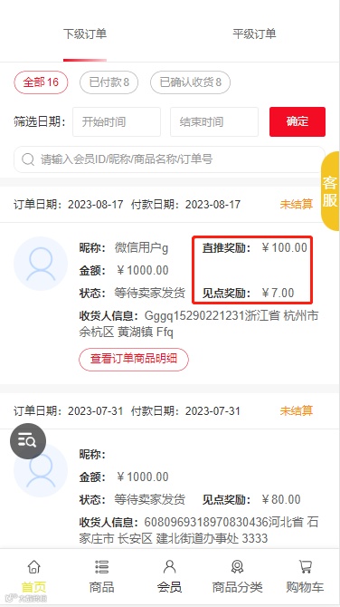 下级订单有什么奖励就显示什么奖励且不显示平级奖励