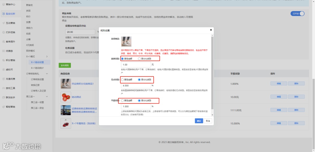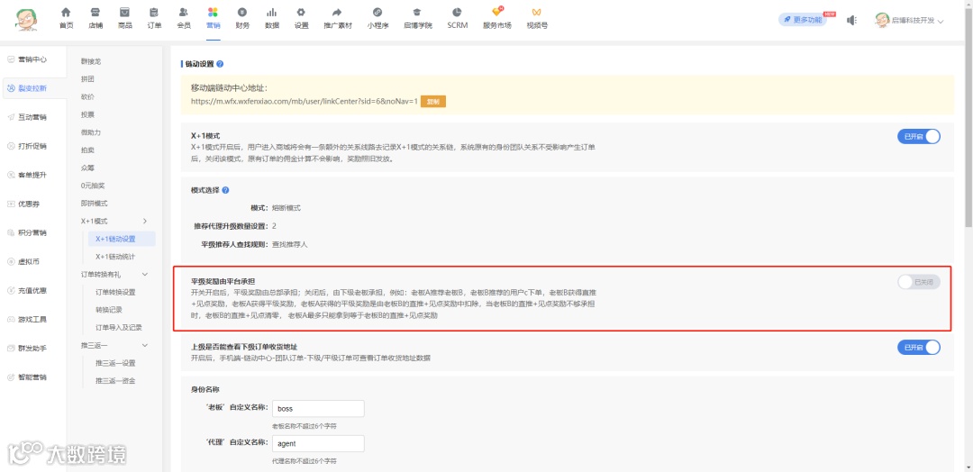 “平级奖励由平台承担”设置项开启和关闭对手机端展示影响: