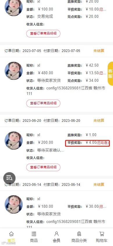 下级订单有什么奖励就显示什么奖励以及平级奖励有已划走标志