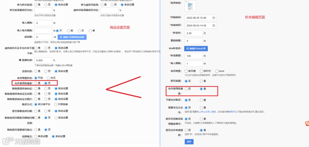 秒杀活动的使用优惠券权限大于单品设置使用优惠券权限。