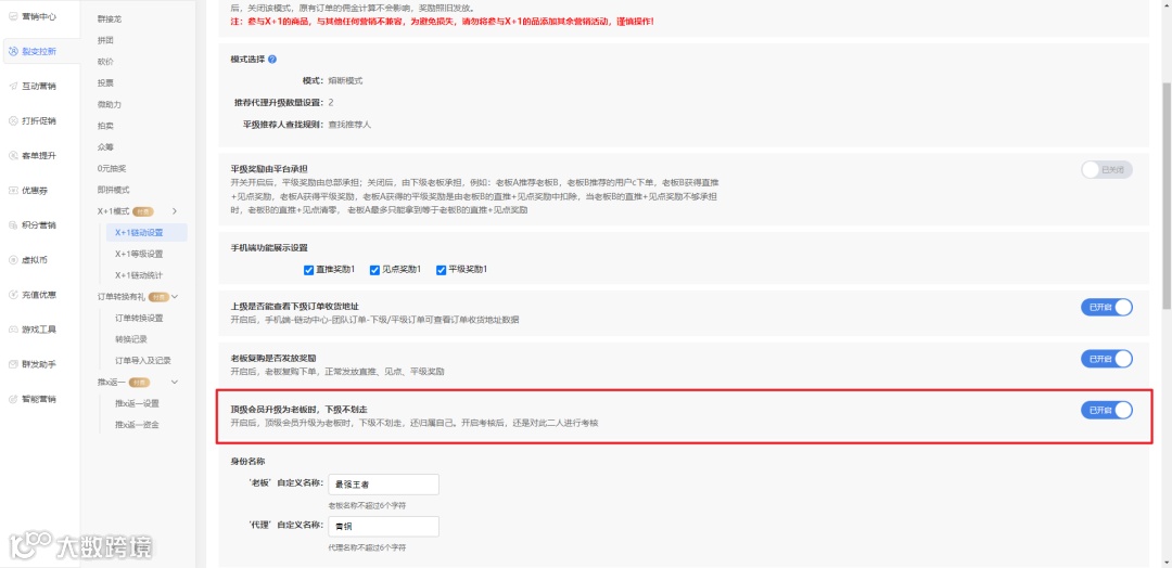 ④新增设置项,开启后-当代理无推荐人时,推荐X个下级后,升级成老板时,下级不划走,依旧是自己的下级
