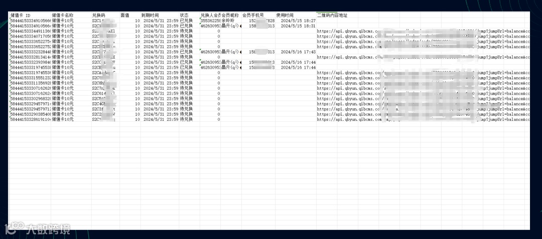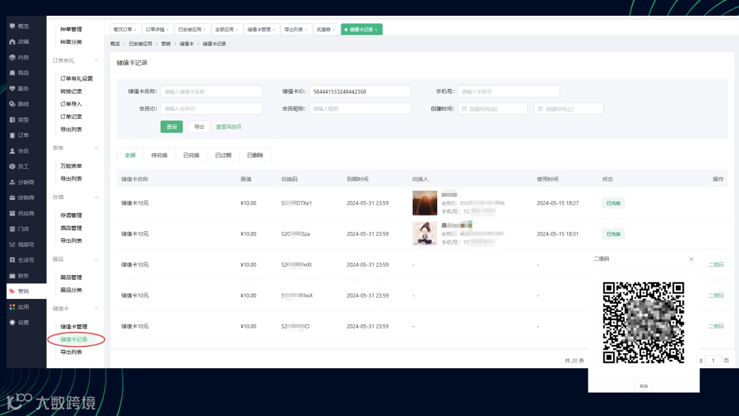所有储值卡的记录都清晰可查,包括名称、面值、兑换码、兑换人、使用时间、兑换状态、二维码等等。