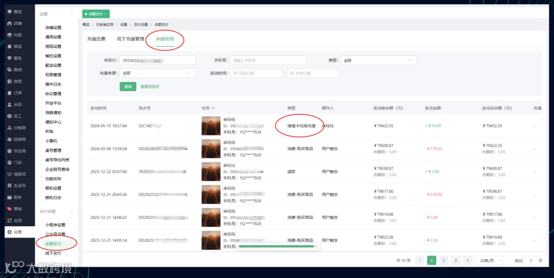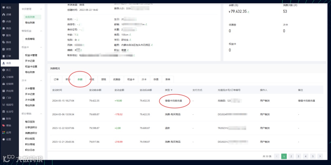 商家可以在会员详情的余额、余额支付的余额明细中查看储值卡的兑换充值记录。