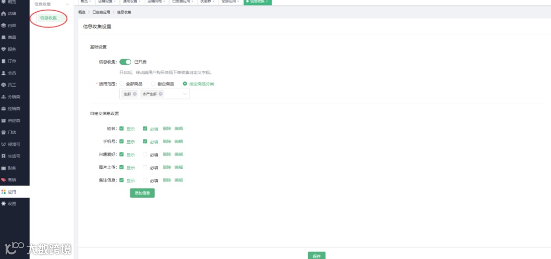 2、信息收集适用范围:全部商品、指定商品、指定商品分类