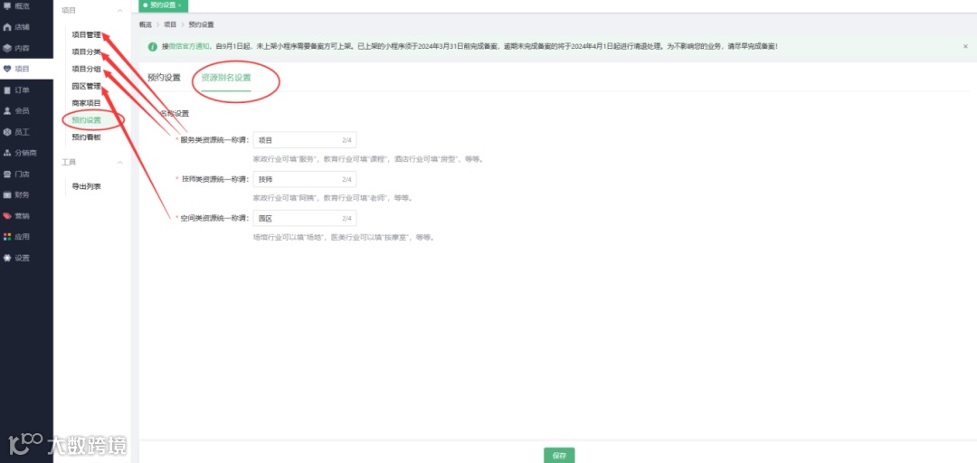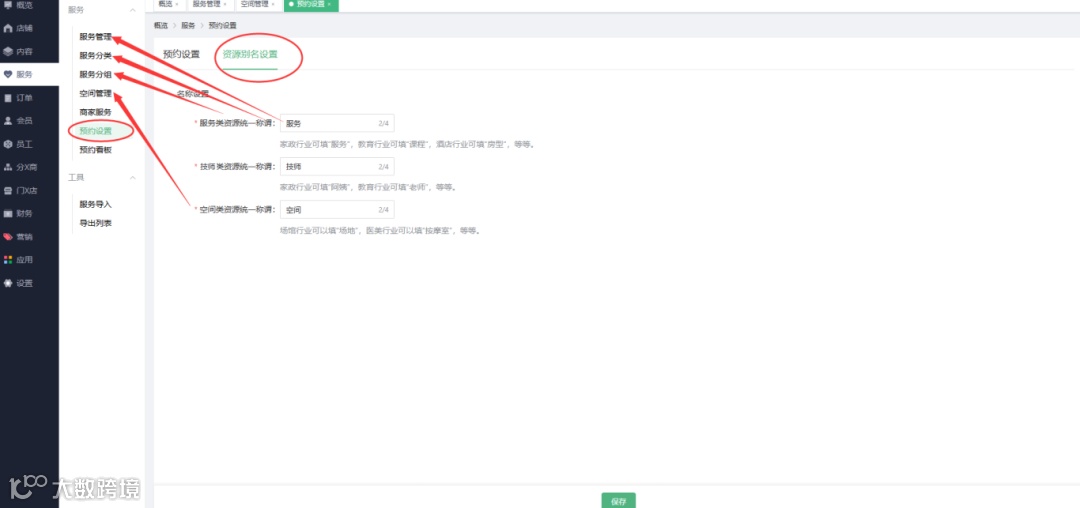 预约设置-“资源别名设置”:可设置服务/技师/空间