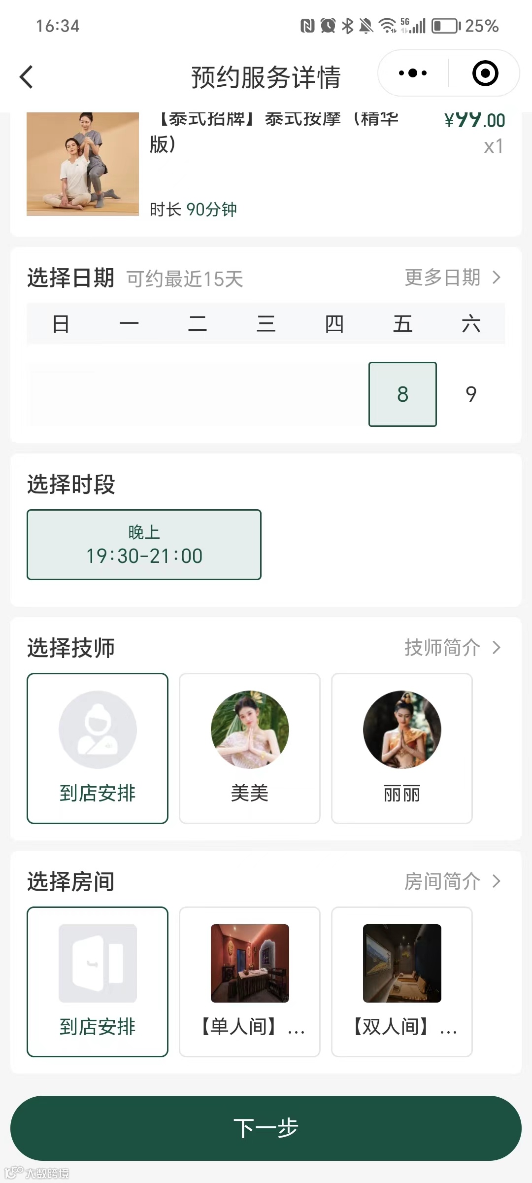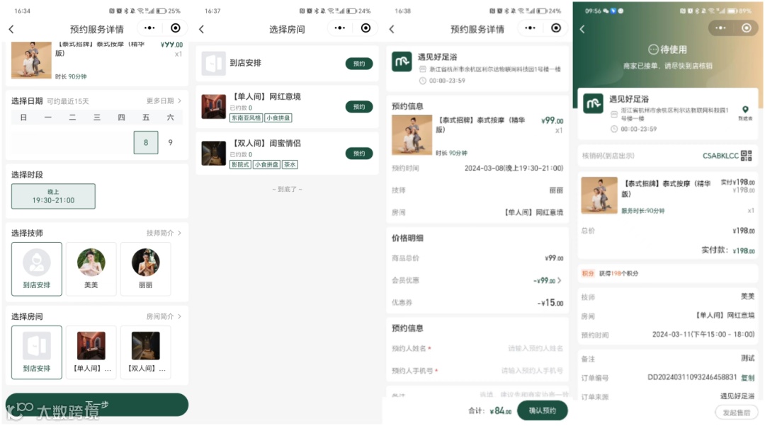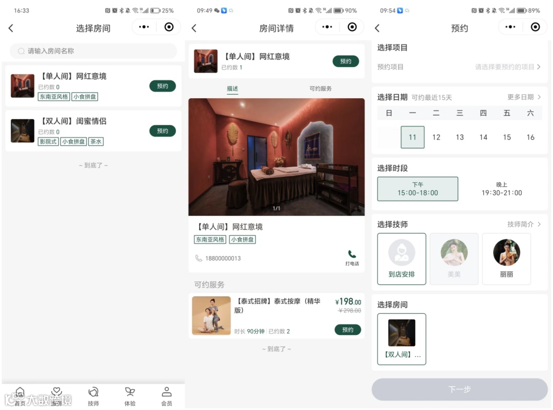 可查看房间详情、选定房间预约服务及时段