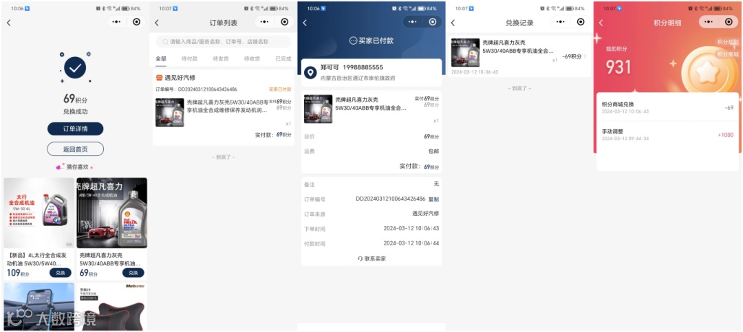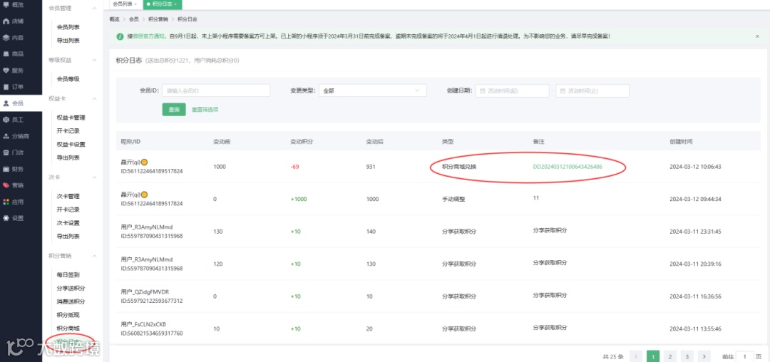 显示积分商城兑换类型,及兑换订单号。点击后可快速打开积分商城订单详情