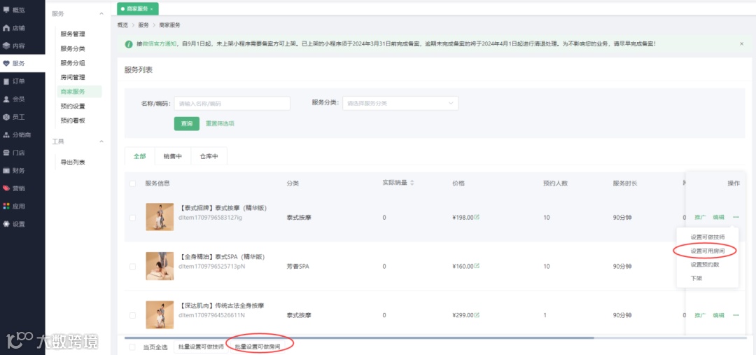 3、商家服务:设置可做技师