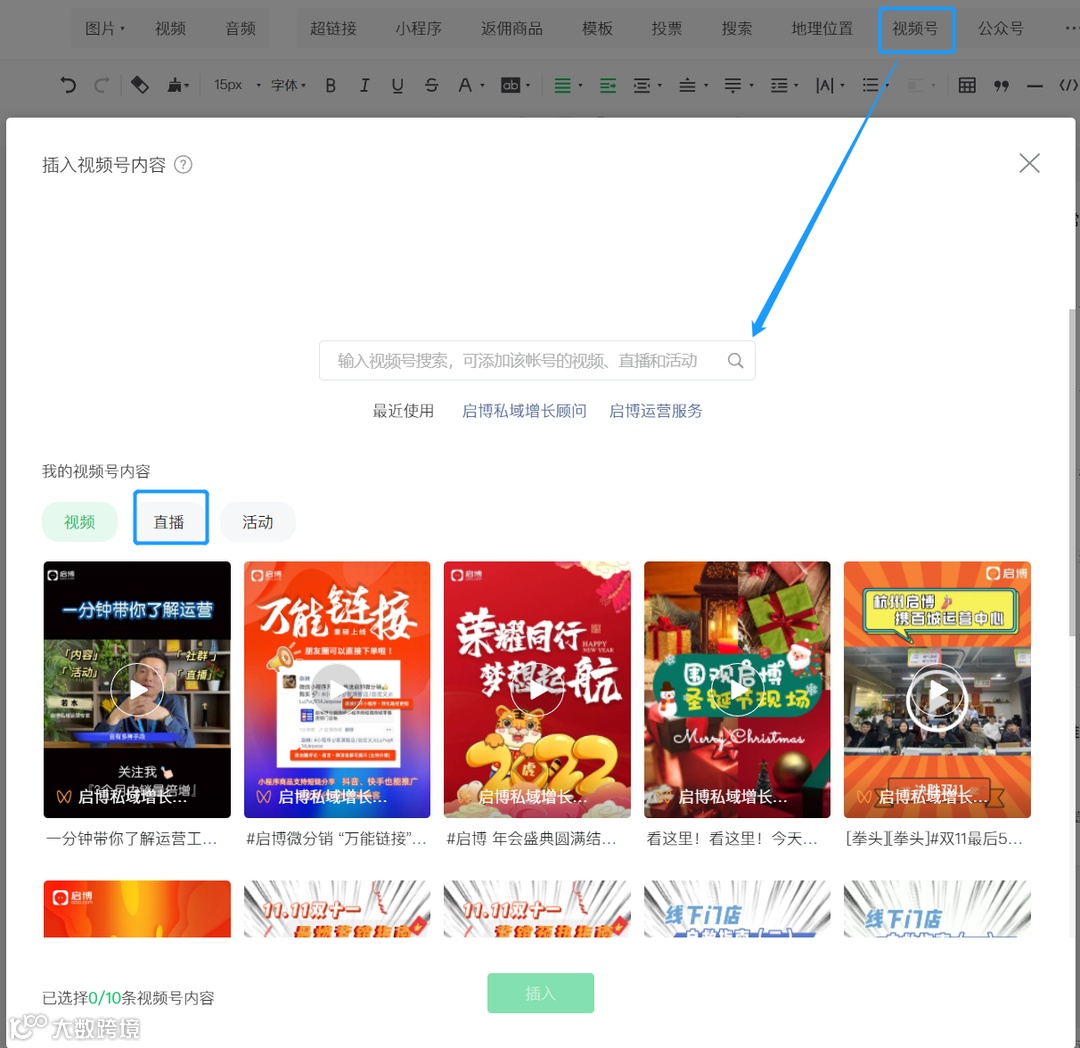 具体操作:点击右上角「视频号」,搜索视频号账号,选择预约卡片,点击「插入」即可。建议编辑推文不要一上来就插卡片,打硬广。要找到与话题相关的切入点,让用户察觉痛点,对直播产生兴趣,再在文章插入预告,转化率自然会提高。