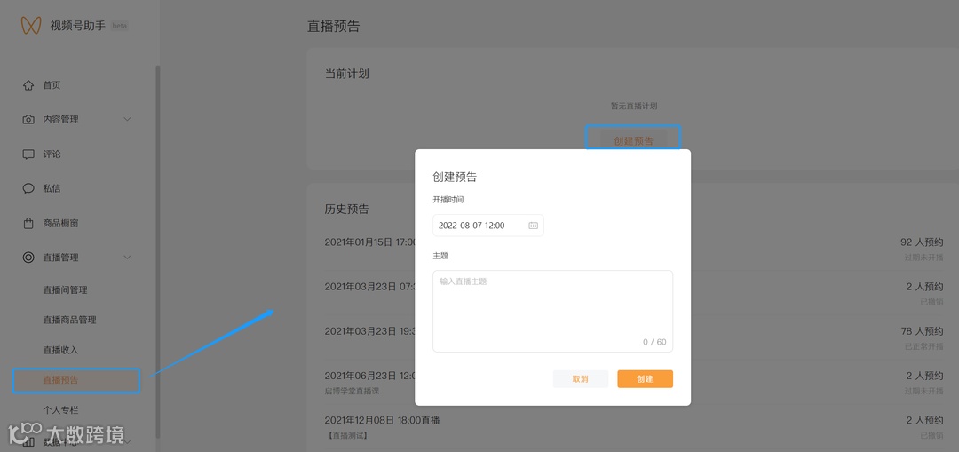 1、视频号发起直播预告:视频号可以同时创建100条直播预告,一次宣传即可为多场直播引流。
