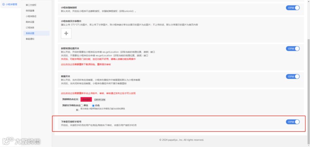 下单授权手机号,开启后,用户在下单页面点立即下单时,判断用户是否授权手机号,默认关闭;