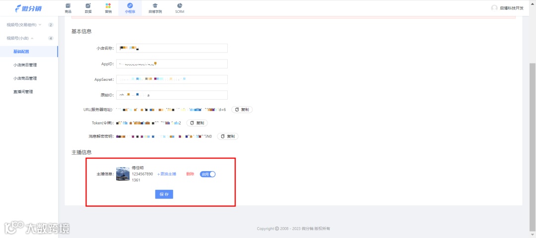 (微分销测试后台-视频号小店功能页面截图)