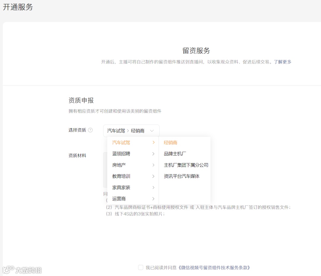 需要注意的是,申请留资服务,必须完成视频号企业认证,且通过资质申报,目前仅支持汽车试驾、蓝领招聘、房地产、教育培训、家居家装、运营商这6个类目才能创建组件,添加留资组件链接,其他类目暂未开放。
