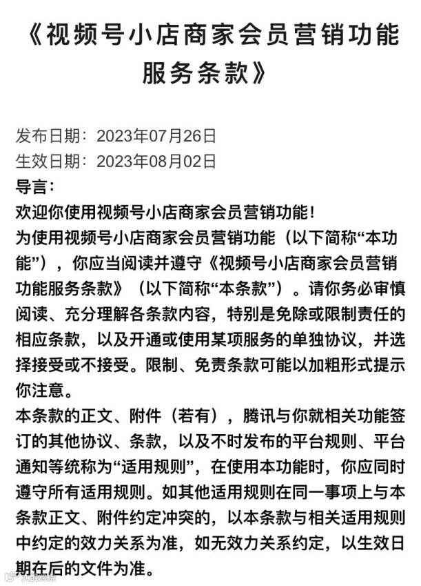 伴随着视频号【添加企业微信】功能的下线,在8月2日视频号小店商家会员营销功能”正式生效。“新功能”开通后,商家可以自行配置会员服务,包括但不限于会员的经验值获取规则、会员名称、会员等级卡片、会员权益(包括开卡礼、会员券、会员群等)、会员协议规则、会员任务、会员积分规则、积分商城等,商家也可以调用接口自行对用户会员积分进行管理。