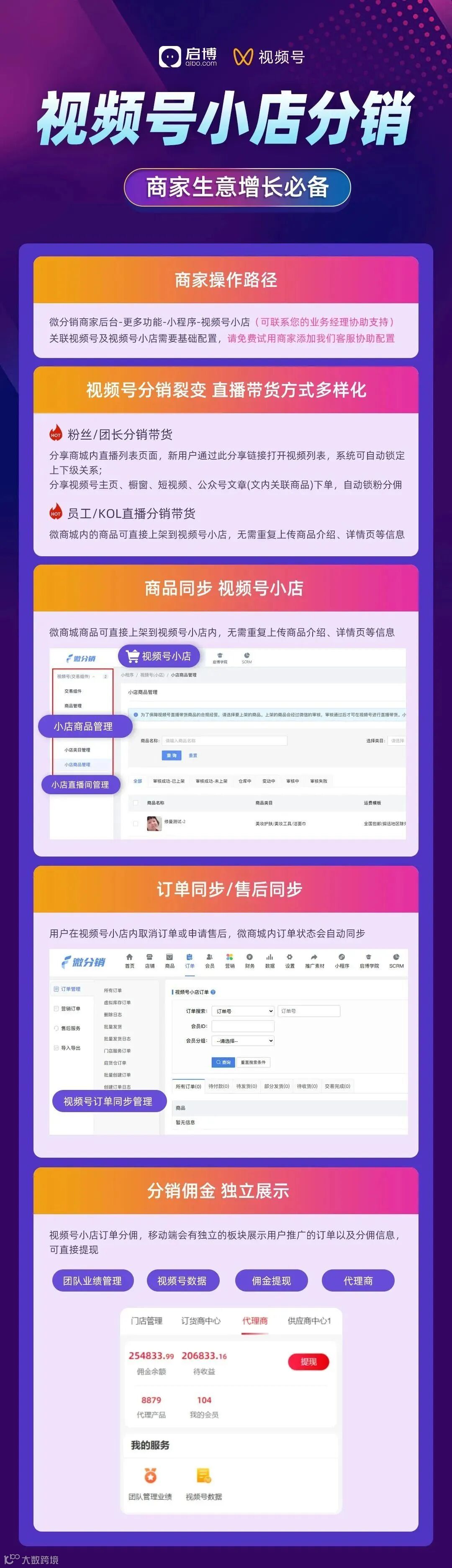启博已上线【视频号小店分销解决方案】,启博微分销商城系统已与视频号小店打通,为商家提供多种视频号公域转私域锁粉方式,如分享视频号主页、橱窗商品、视频号短视频、公众号文章(文内有商品链接)下单后,实现自动锁粉分佣!