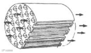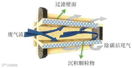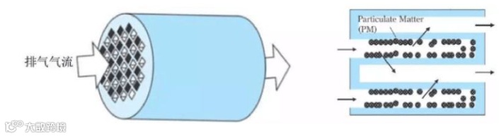 主要以壁流式蜂窝陶瓷为载体,载体体内有很多平行的轴向蜂窝孔道,相邻的两个孔道内一个只有进口开放,另一个只有出口开放。