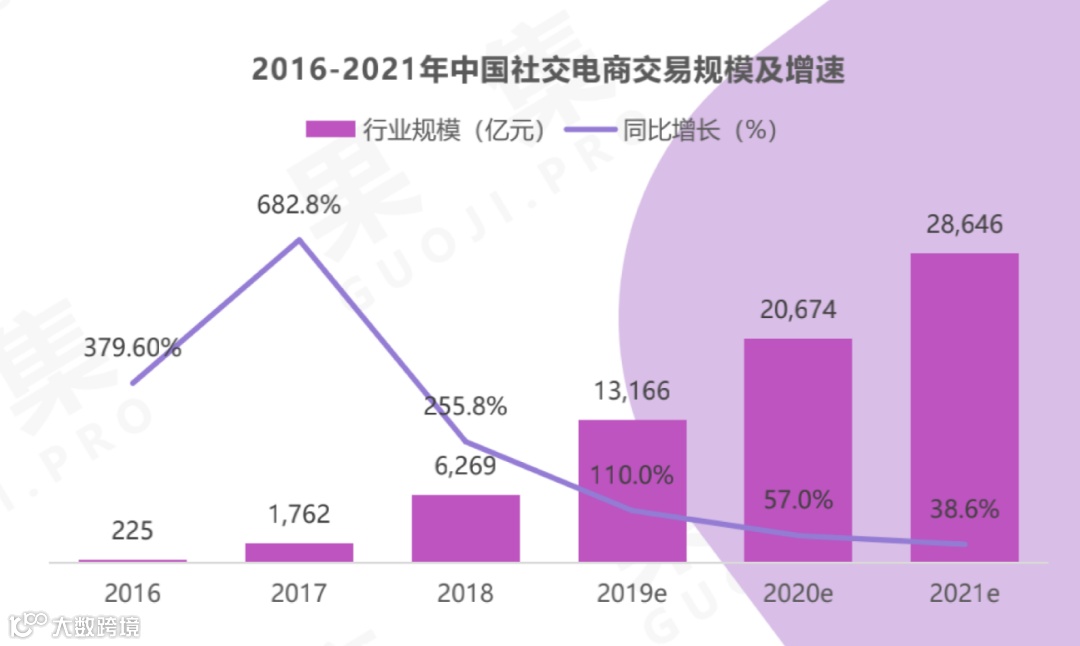 《2021年上半年社交电商行业分析报告》显示:2019年,社交电商行业规模就达13166亿元,同比增长110%,占网络购物市场整体规模的12.38%。