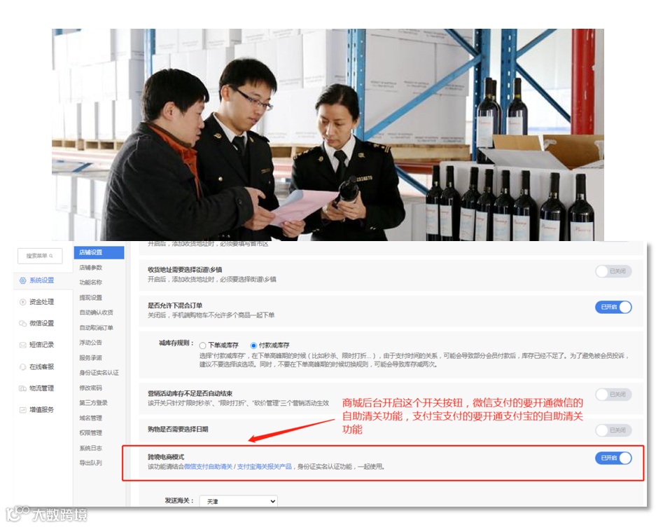 消费者在微商城使用什么支付方式就对应开启自助清关功能,目前启博微分销跨境电商系统支持微信、支付宝快速自助清关。
