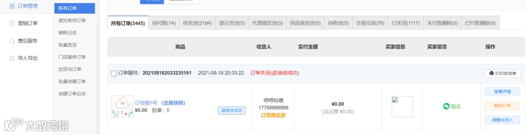 (3)后台同意退款申请,订货商出库订单取消订单成功。