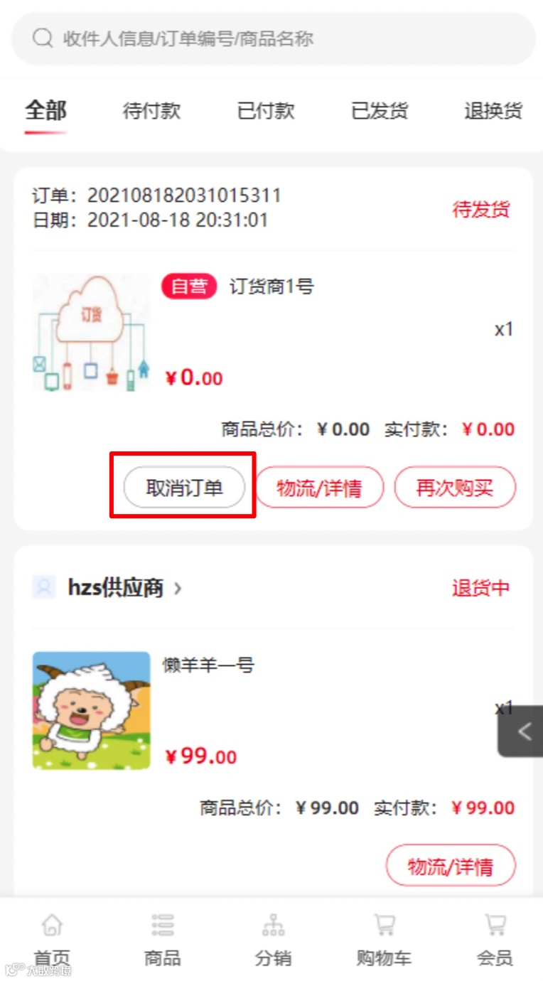 手机端订货商中心-虚拟库存出库后,在订单列表增加取消订单按钮,取消后,订单状态关闭,库存返回到订货商虚拟库存中;