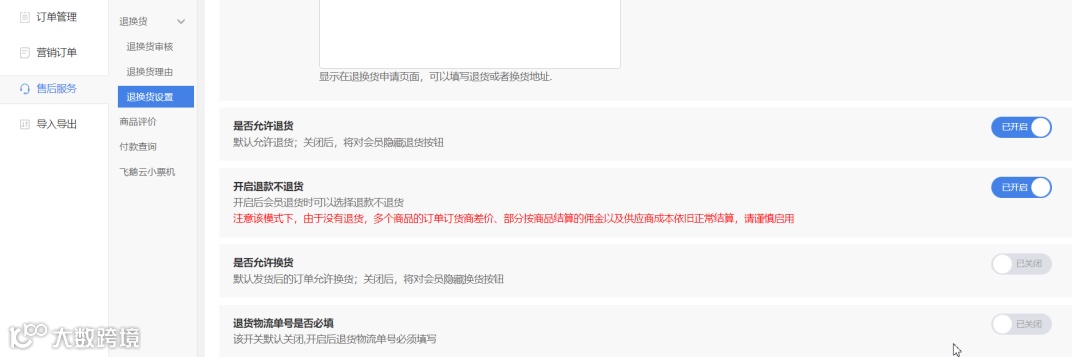 退换货设置里新增配置项“是否允许退款不退货”,默认关闭状态,提示文案:开启后会员退货时可以选择退款不退货,(标红:注意该模式下,由于没有退货,多个商品的订单订货商差价、部分按商品结算的佣金以及供应商成本依旧正常结算,请谨慎启用);