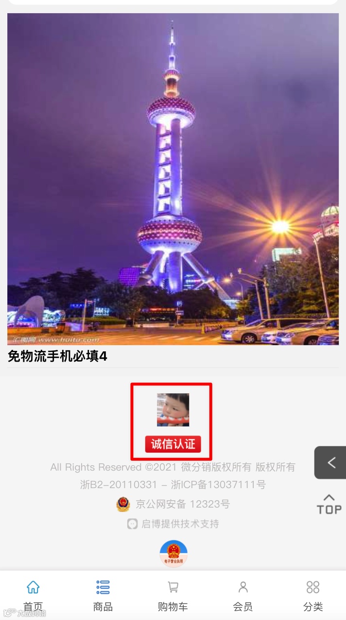 (3)手机端页面底部和商品详情页显示“诚信认证”图标,点击会跳转商城水滴信用页面。