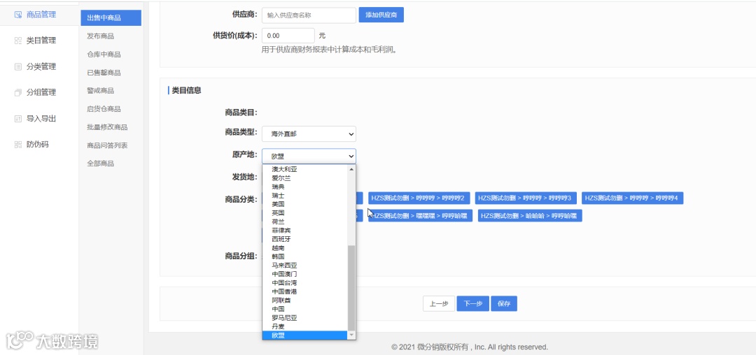 (1)编辑商品,选择海外直邮或保税商品,选择新增的原产地国家;