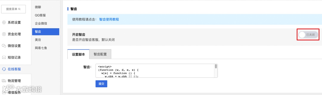 设置-在线客服-智齿/美洽/网易七鱼,增加 "是否开启智齿/美洽/网易七鱼客服功能",开启后,可以设置配置信息;关闭后,不显示配置信息;
