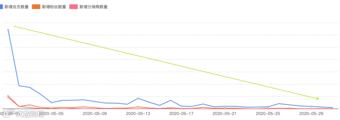 ① 【流量增长缓慢】上线第一天结合商城的首发活动,吸引了一批初始会员。然而,随着活动结束,公众号资源的逐步减少,仅靠自然流量导致会员新增出现断崖式下跌,且增长缓慢。