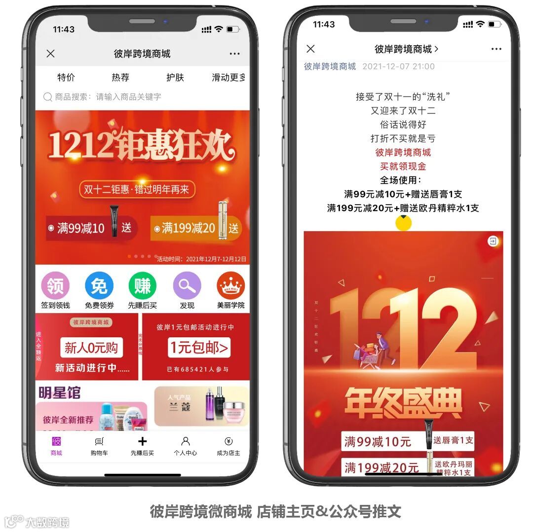 彼岸跨境微商城在双十二来临之际,上线了“1212钜惠狂欢”活动,即消费者在彼岸跨境商城消费满99元减10元+赠送唇膏1支、满199元减20元+赠送欧丹精粹水1支,优惠券适用于微商城内所有商品。