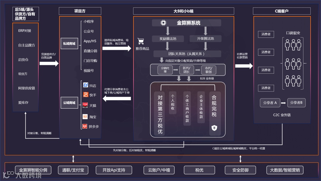金算狮全域渠道营销解决方案包含:全域渠道营销解决方案业务、代理分销SDK业务、社群电商解决方案业务;