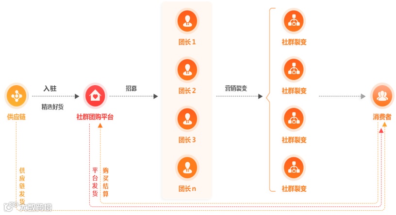 社群电商作为社交新零售创新模式之一,商家与用户之间实现直接零距离沟通,通过好友关系以及二度、三度甚至完全陌生的关系和人脉不断建立新的链接纽带,借助社交强关系达到销售目的,品牌方通过团长进行裂变分销。