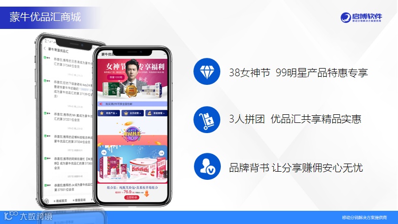 2019年底,爆发了新冠肺炎疫情。正值春节期间,蒙牛常温系列产品,包括特仑苏系列,纯甄系列产品严重滞销,积压了大量库存。为了减轻库存压力和减少损失,2020年,蒙牛集团又一个项目与启博软件达成战略合作,火速搭建线上商城平台——蒙牛常温优品汇商城,借力疫情期间所产生的线上流量红利,设计社交新零售的模式,发展新的业务线,打造私域流量。
