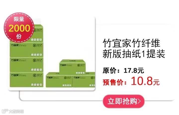 小编最喜欢的就是竹宜家的纸巾了~~不仅亲肤、环保,而且天热不漂白,无尘无屑无刺激,连小宝宝都是可以用的!看了一眼双十一价格,小编自己都怀疑人生:双十一10.8元疯抢10包抽纸!!真的很有诚意了!!除了这款,还有9.9元14卷无芯卷纸!!还在等什么,赶快去加购吧!!