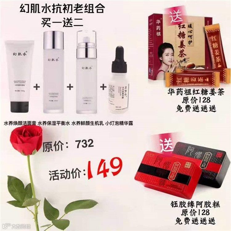 这个爆品套装主打清洁补水保湿初康老,包含水养焕颜洁面膏1支+水养保湿平衡水1支+水养鲜颜生机乳1支+小灯泡精华露1支。11月12日前下单,买一送二,加送阿胶固元膏和红糖姜茶各一份。