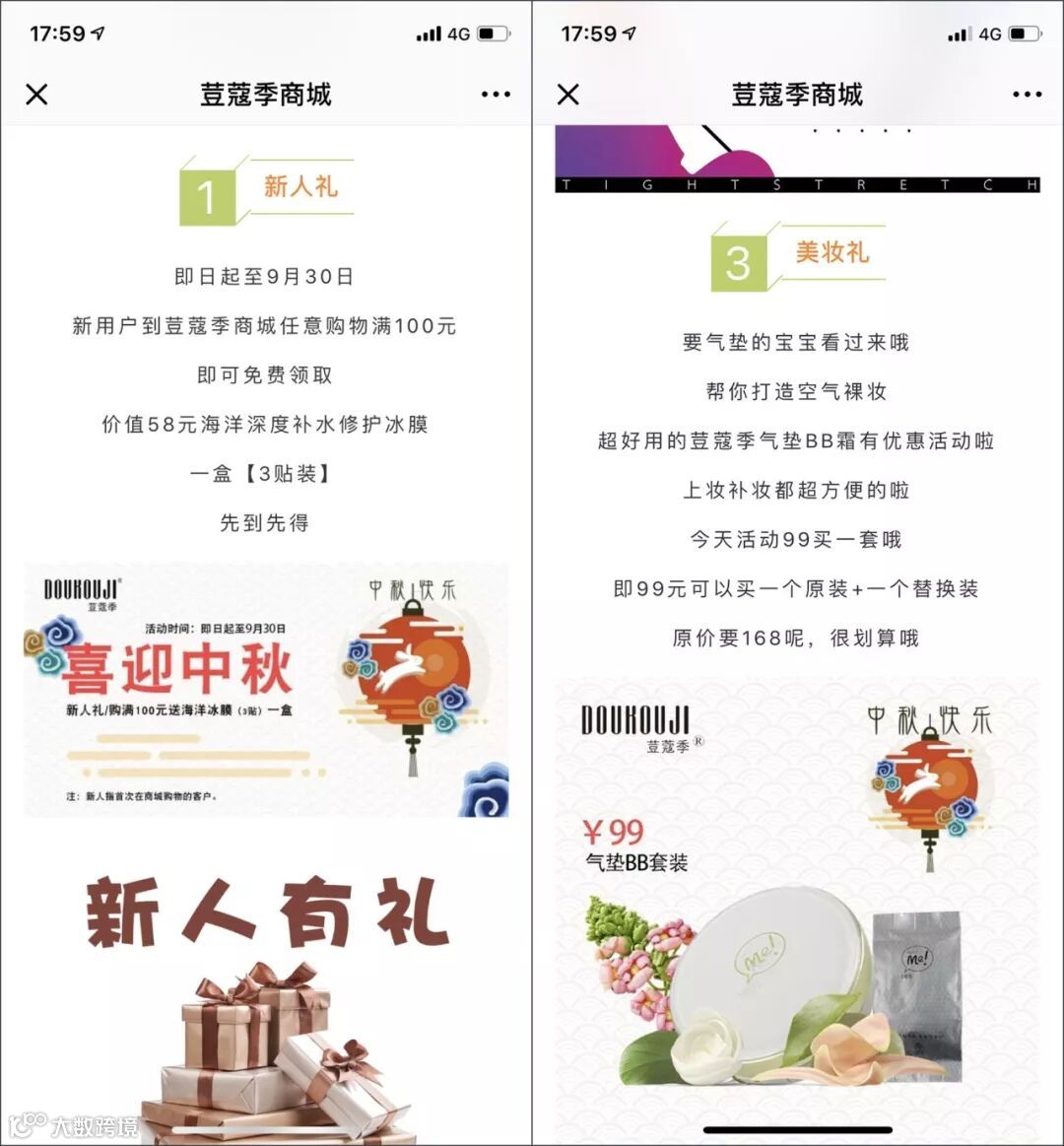 最近的中秋国庆相继来临,豆蔻季商城在明确自身的拉新、留存等需求的前提下,推出包括新人礼、回馈老客户、买赠活动等多项优惠活动,完成商城吸粉、老客户维护的目标。