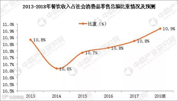 餐饮是消费行业中的重头戏。近几年来,随着消费升级,大众消费观念的改变,餐饮在消费中的占比越来越重。自2014年起一直保持着上升的趋势,比重从2014年的10.6%上升至2017年年的10.8%,。预计2018年餐饮收入比重将继续上涨,为10.9%。