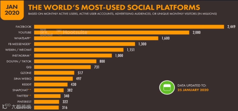 从这份数据统计中,我们能够看到在我们日常生活或者职场中常用的社媒的一个排名,其中FB、youtube、whatsapp占有主导地位。