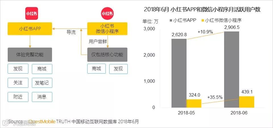 生态流量的导流价值:小程序仅提供核心功能服务,其他诸如发笔记、关注等社交参与度较高的功能,需使用APP,以此激励用户下载APP。