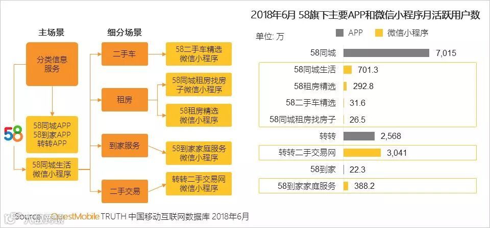 生态流量的新增场景价值:58的微信小程序布局由多个小程序构成矩阵,以主场景—细分场景—个性化触点,为用户提供更简洁高效的服务。