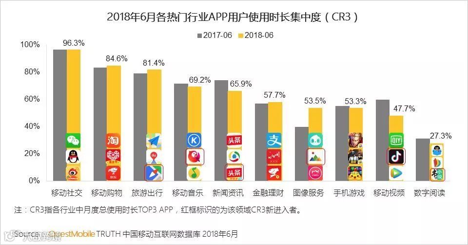 移动购物、旅游出行、图像服务等行业用户集中度进一步提升。